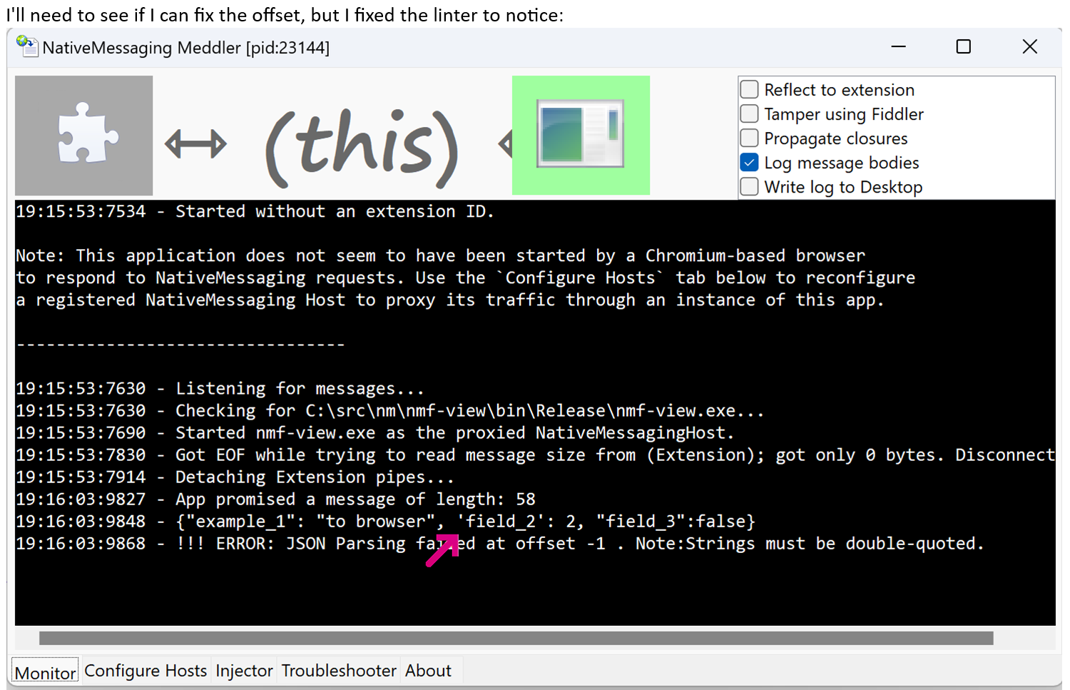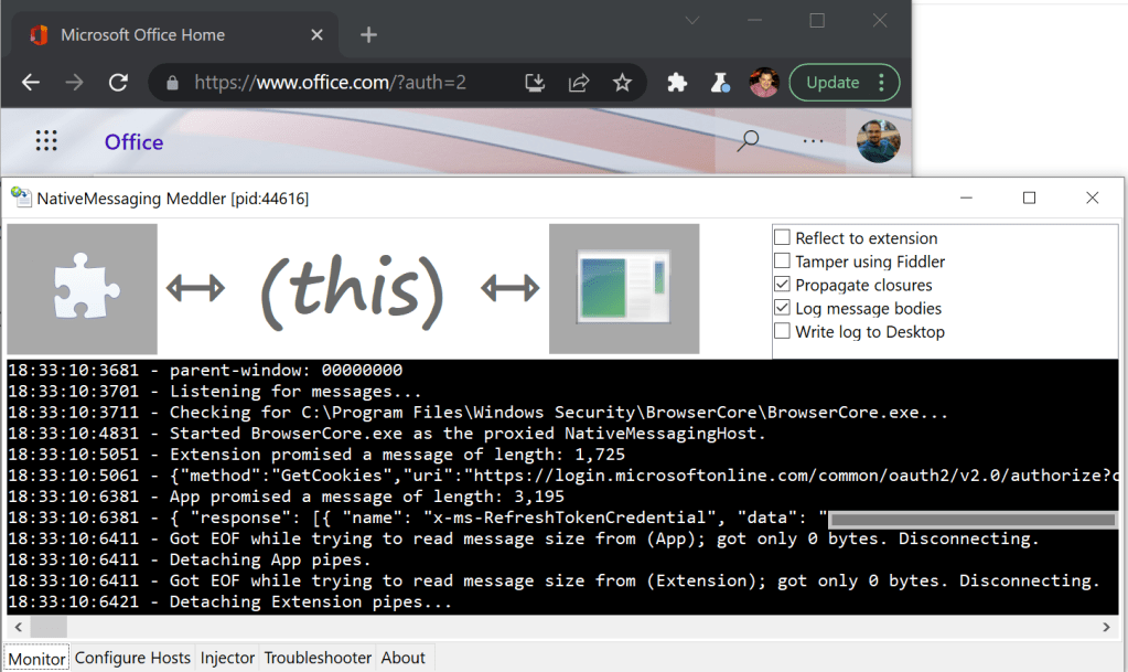 As a part of my recent NativeMessaging Debugger project, I built a simple sample extension which watches for navigations and sends information out to a log window. For this exercise, I updated it to also watch for WebRequests. With this new logging in place, I reproduced the scenario, and it was plain that the fetch() call to the WebAPI was being cancelled due to navigation: