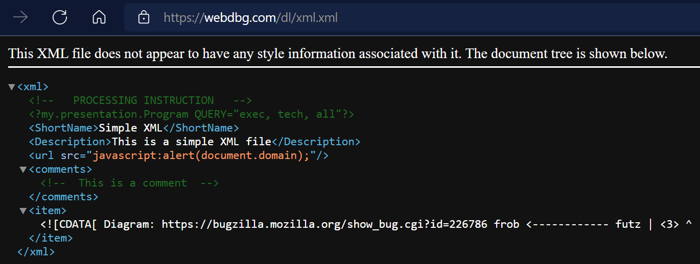 If the user navigates to an XML file that lacks an XSLT, the XML parser calls GetDocument()->SetIsViewSource(true); which results in the browser rendering the plain XML as a document tree: