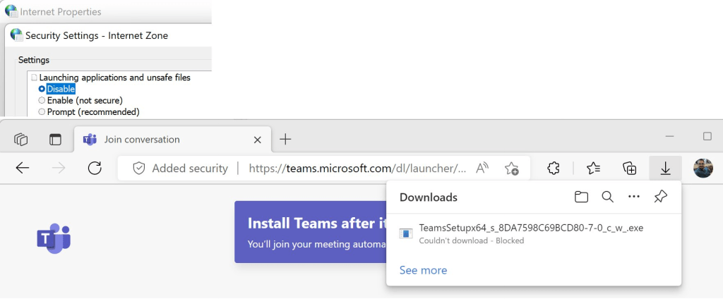 Beyond the aforementioned impact when the policy SmartScreenForTrustedDownloadsEnabled is set, if you’ve configured a Zone’s setting for Launching applications and unsafe files to Disable using the Windows Internet Control Panel’s Security tab (or the associated Group Policies), Chromium-based browsers will block file downloads from the Zone in question with a terse note: Couldn't download - Blocked.