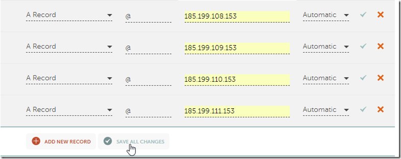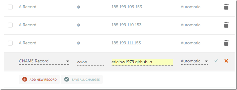 14. Click Add New Record and add a new CNAME Record. Enter the host www and a target value of username.github.io.Click Save All Changes: