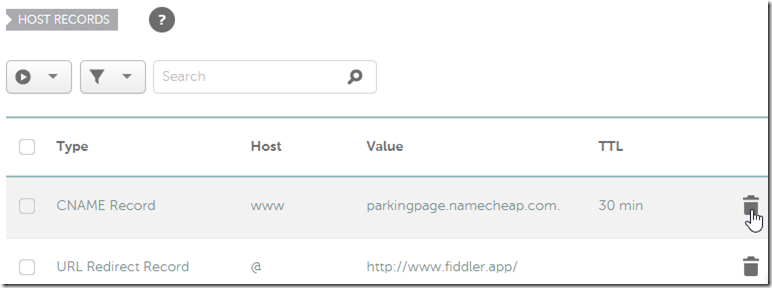 15. Click the trash can icons to delete the two default DNS entries that NameCheap had for your domain previously: