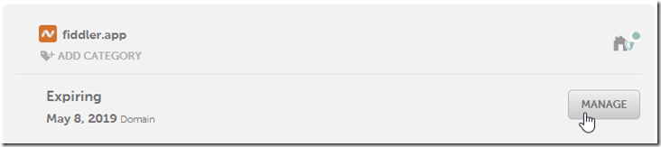 9. Login to NameCheap (or whatever DNS registrar you used) and click Manage for the target domain name: