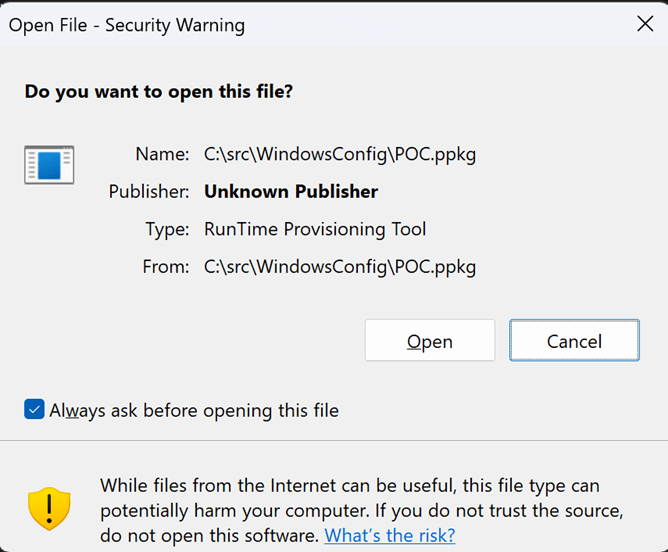 To address a spoofing attack in 2024, the Internet Explorer MIME Handler security dialog was enhanced. First, it now clearly identifies itself as a security warning, and indicates that the file may be harmful. Next, it was updated to ensure that the filename extension is broken out on its own line to mitigate the risk of user confusion: