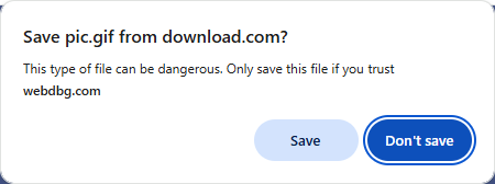 Prompt to save a file with a confusing name (“Pic.gif from download.com”); the user thinks it’s an image, but it’s an executable of type COM.