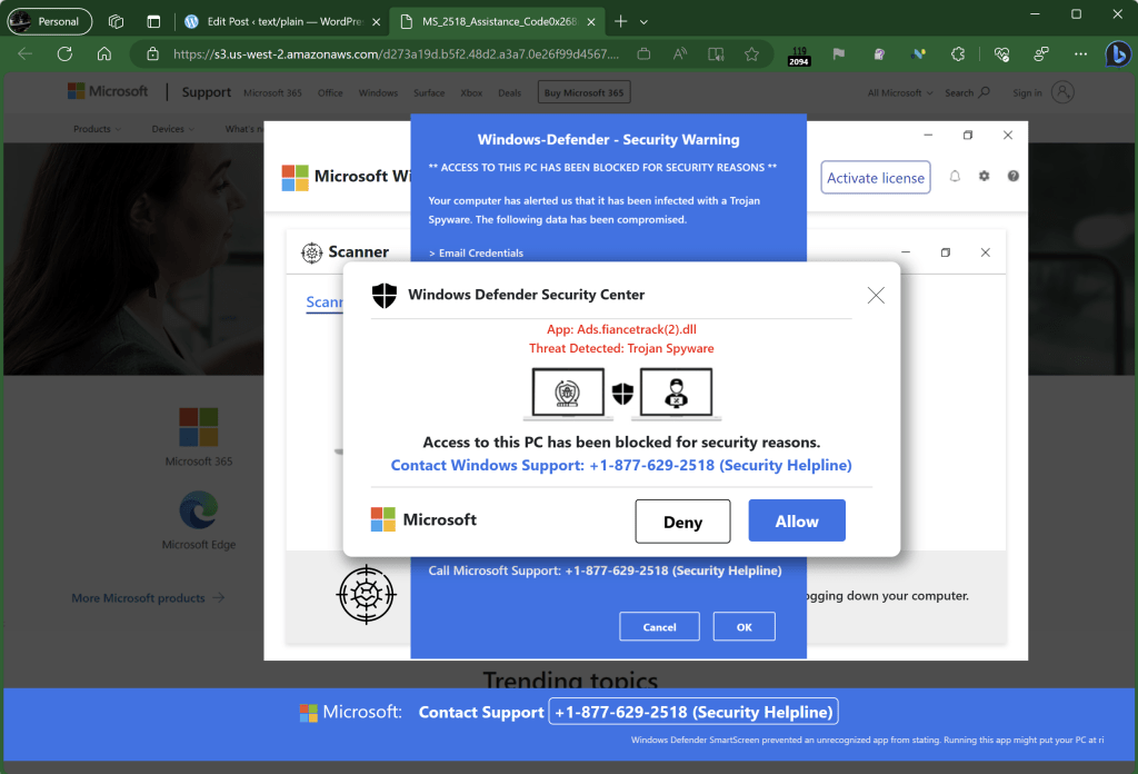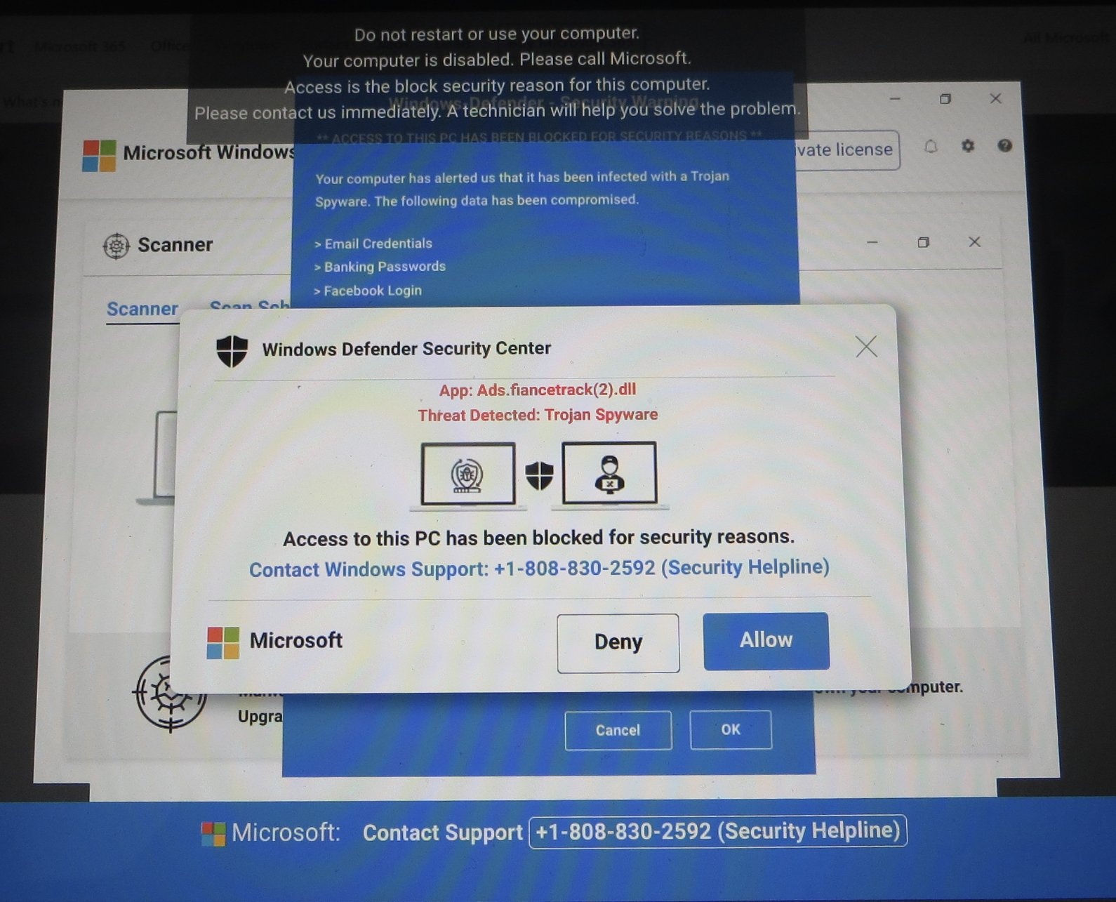 Attack pages show text in a black box near the top-center of the window to try to confuse the user so they don’t see the browser’s hint that the browser is now in full-screen mode and hitting the Escape key will exit. They make the attack even harder to escape using the Pointer Lock API (which hides the mouse pointer) and the Keyboard Lock API (so exiting fullscreen requires that the user hold the Escape key). They increase the urgency with animation and even a computerized voice claiming that the user’s machine is under attack and they should call immediately to avoid damage. Some attacks will use tricks to cause the browser to become sluggish (e.g. by spamming the IPC channel between the renderer and the browser process) to make it harder for the user to escape the attack page.