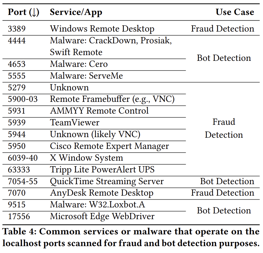 The authors (incorrectly) posit that the probing scripts could detect information about any server running on the target port, but thanks to how WebSocket handshakes work, that’s not possible. Instead, the best the script could do is perform a timing/error analysis to determine whether there’s any service listening on the port [Demo/Article].