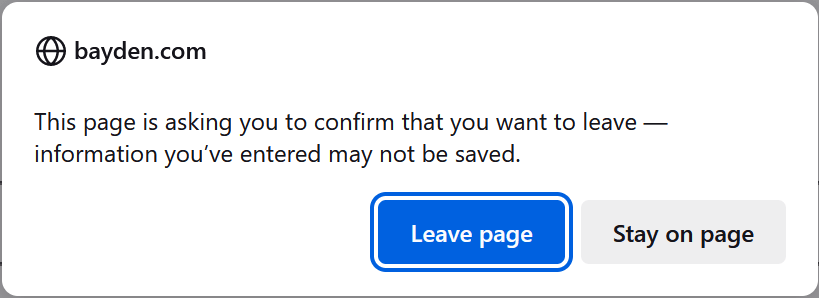 You might hope that you could just update your page’s DOM to show a alert message beside the built in prompt (“Hey, before you go, can you go verify that the setting <X> is what you wanted”, but alas, that doesn’t work — DOM updates are suppressed until after the dialog is dismissed.