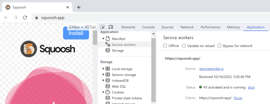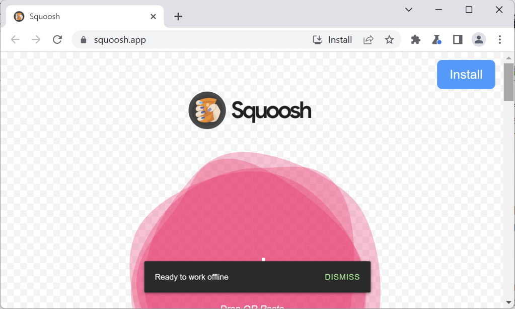 For example, consider https://squoosh.app, a site that allows you to see the impact of compressing images using various tools and file formats. When you first visit the site, it provides a hint that it has installed a ServiceWorker by showing a little “Ready to work offline” toast: