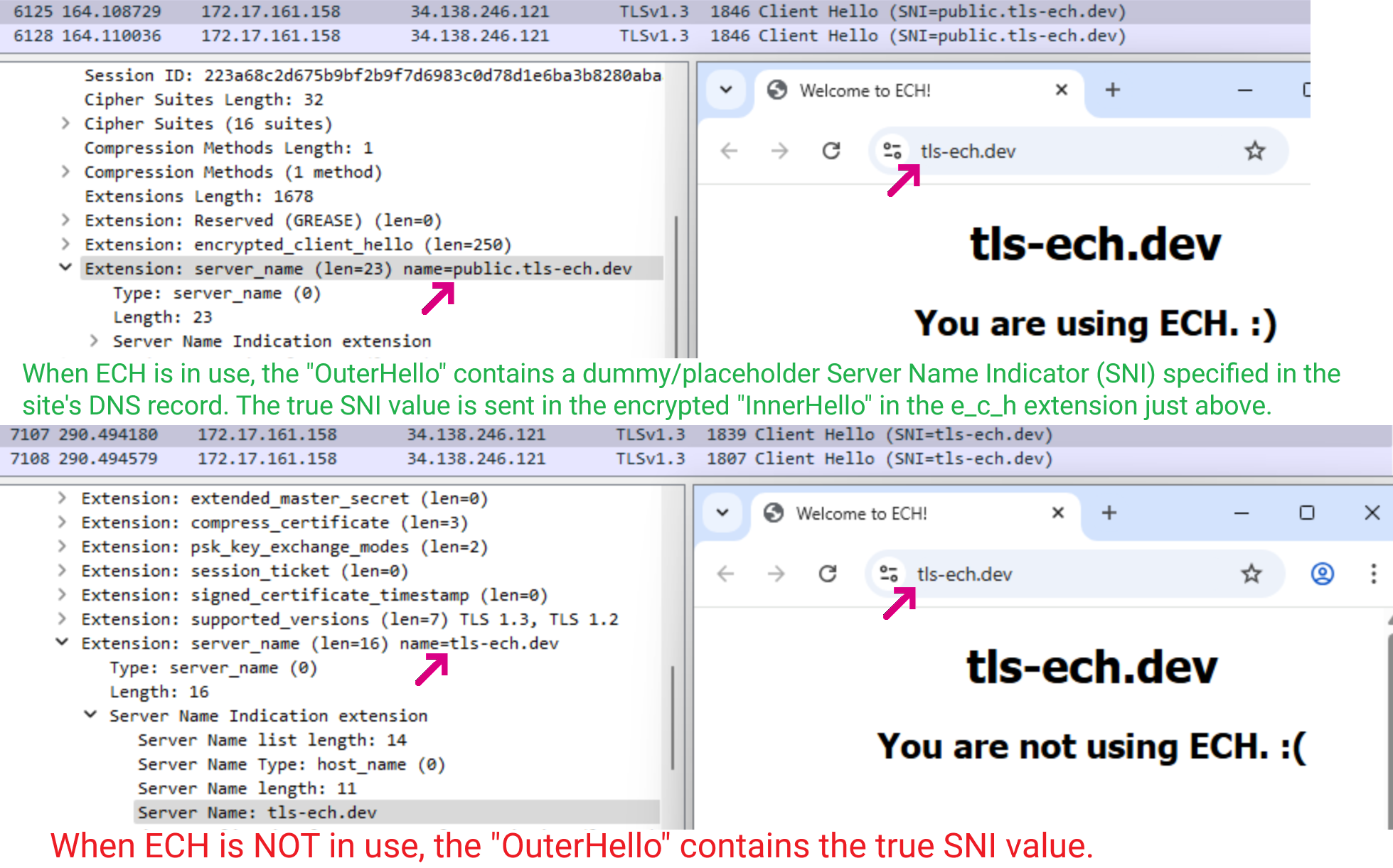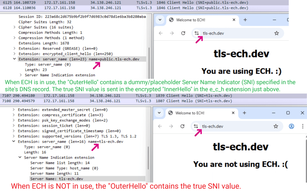 Additionally, a new feature called Encrypted Client Hello (ECH) means that browsers can no longer spy on the first few packets of a TLS connection to see what server hostname was requested. For example, in loading the https://tls-ech.dev test page with ECH enabled, the client sends a “decoy” Server Name Indicator (SNI) of public.tls-ech.dev rather than the real server name: