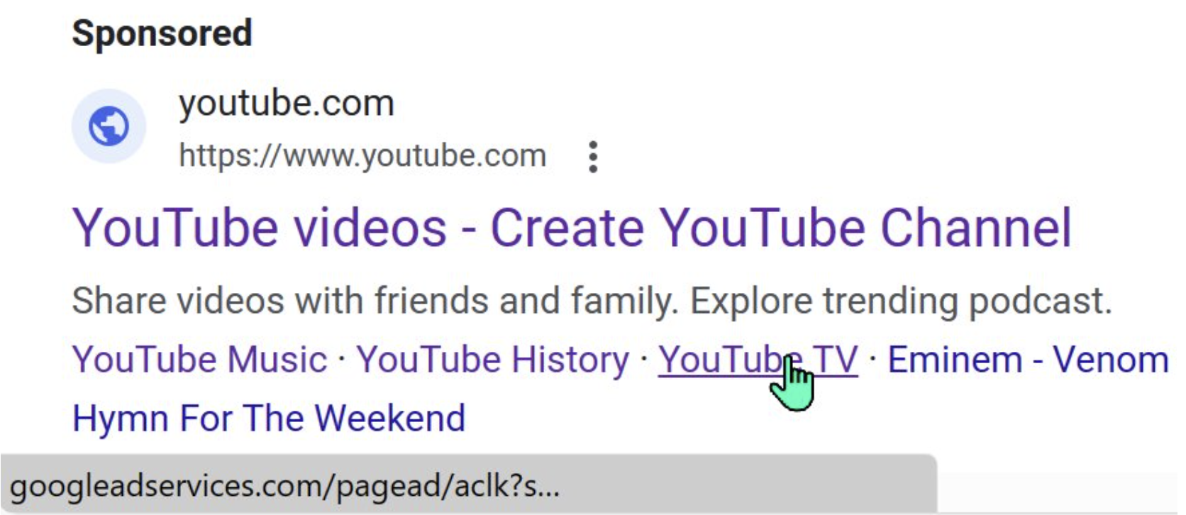Recently, searching for youtube on Google would result in the first link on the page being a “sponsored” link that looked like this: