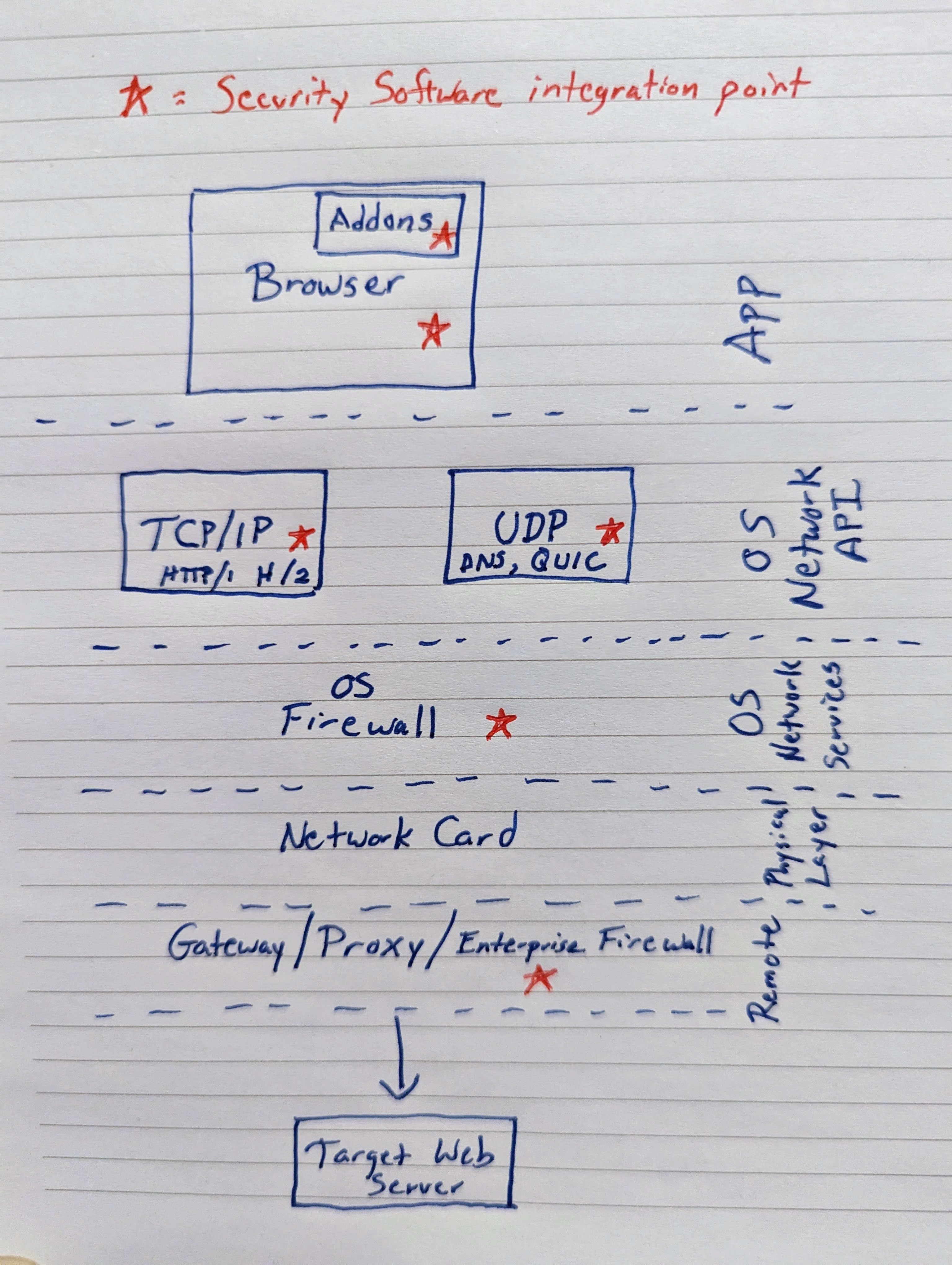 The decision of where to integrate security software is a tradeoff between context and generality. The higher you are in the stack, the more context you have (e.g. you may wish to only check URLs for “active” content while ignoring images), while the lower you are in the stack, the more general your solution is (it is less likely to be inadvertently bypassed).