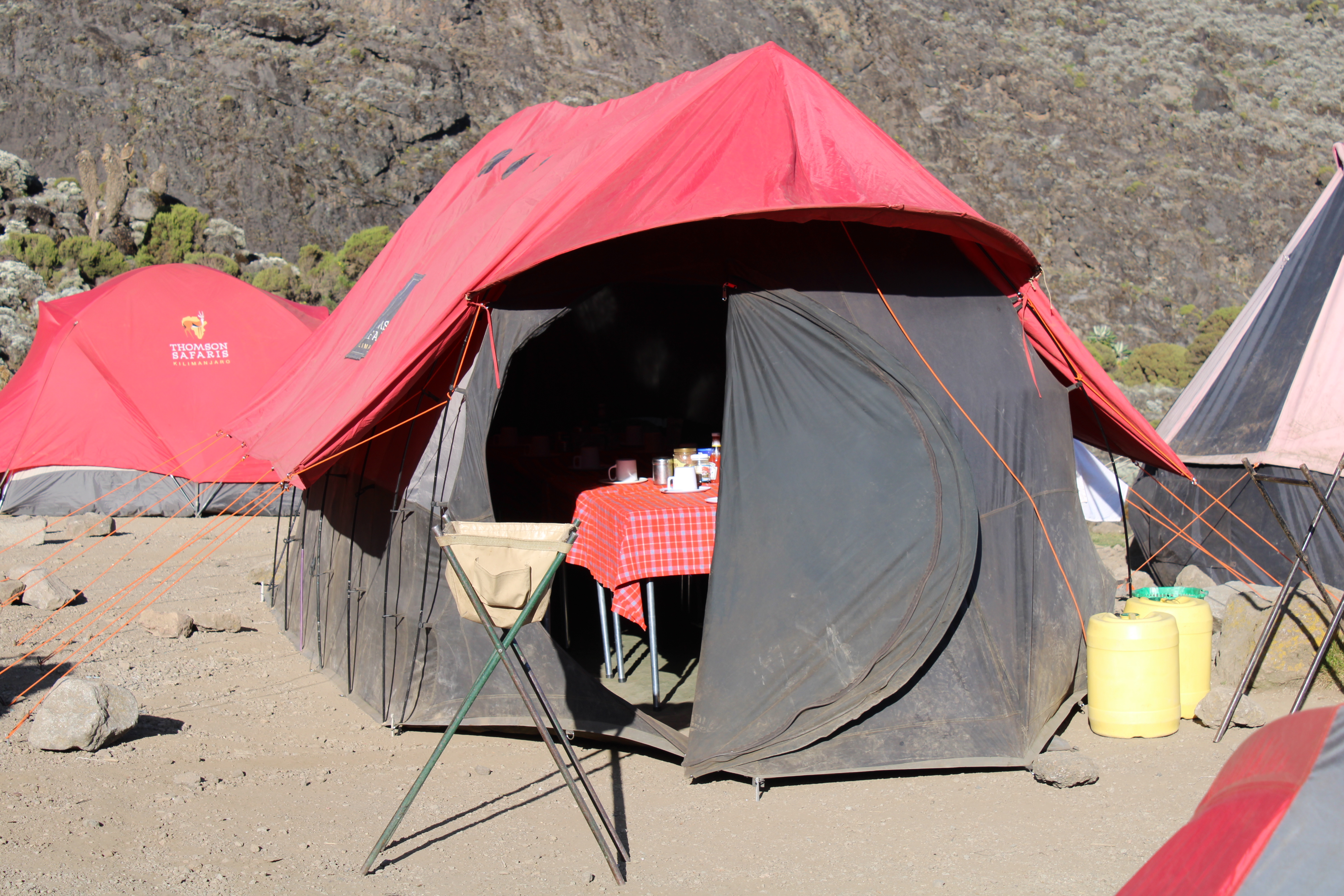 After an easy morning’s hike, we arrive at Shira 2 around lunchtime and sign in at the ranger station. The camp is on a ridge line with incredible views of Mount Meru poking out over the clouds below.